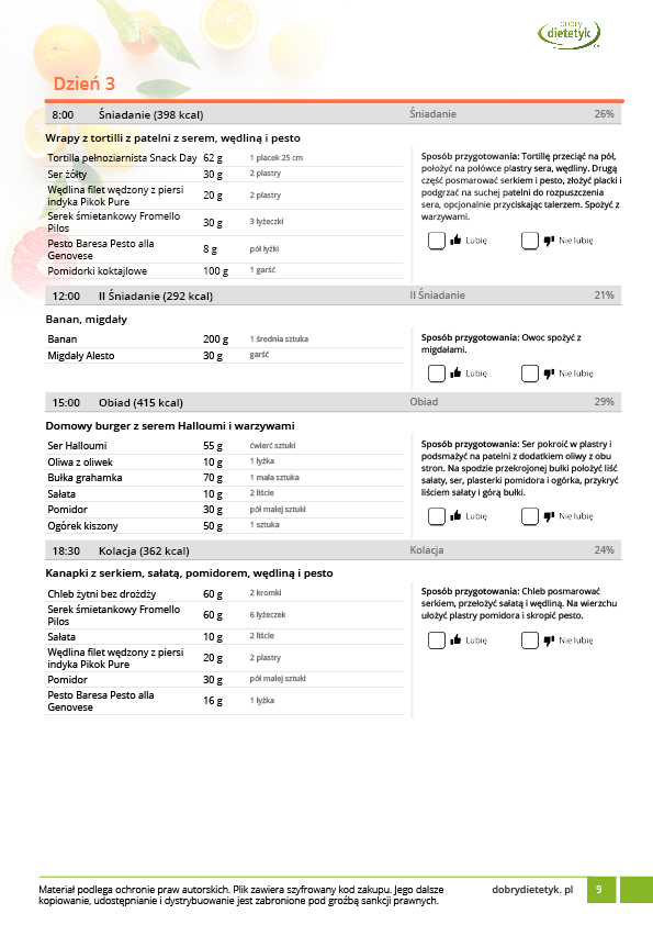 w formie propozycji posiłków (zamiast pojedynczych jadłospisów jednodniowych, przygotowano propozycje kilku propozycji dań na każdy posiłek). Tutaj nie uzależniamy Cię od tego jakie masz np. w danym dniu zjeść śniadanie czy obiad, tylko sam wybierasz sobie ulubione danie z kilku przedstawionych przez nas propozycji.
