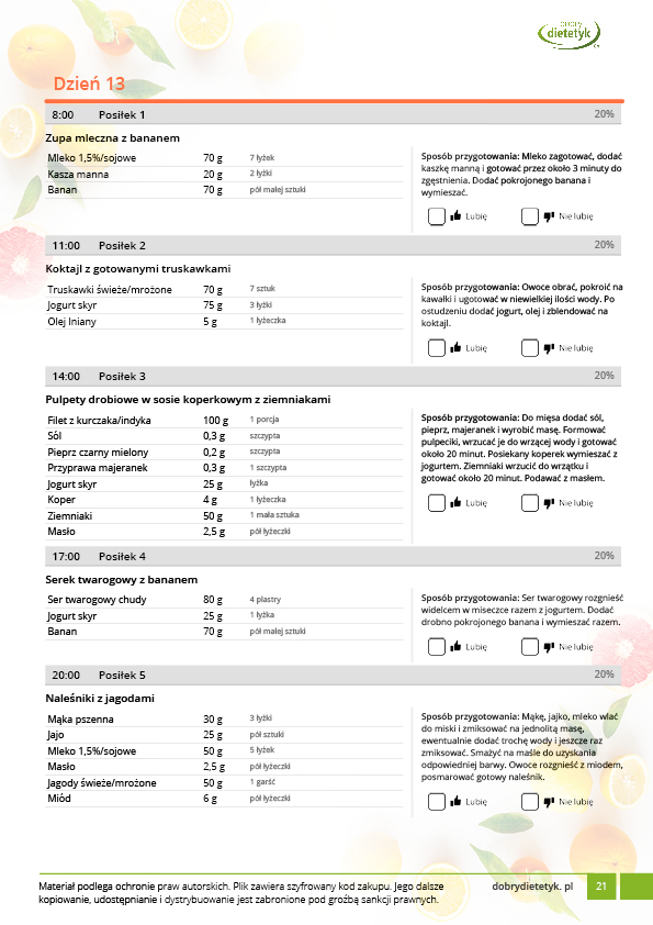 w formie propozycji posiłków (zamiast pojedynczych jadłospisów jednodniowych, przygotowano propozycje kilku propozycji dań na każdy posiłek). Tutaj nie uzależniamy Cię od tego jakie masz np. w danym dniu zjeść śniadanie czy obiad, tylko sam wybierasz sobie ulubione danie z kilku przedstawionych przez nas propozycji.
