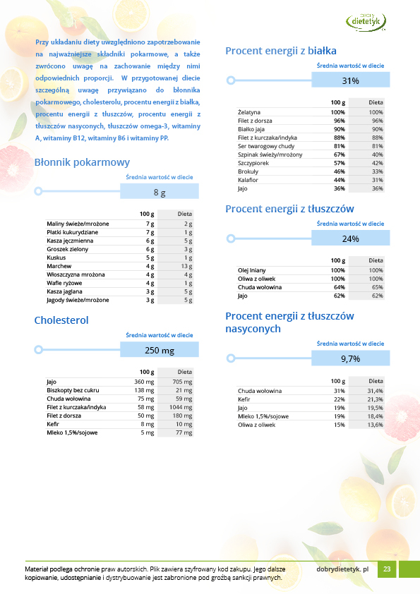 Dodatkowo do opracowanego planu dietetycznego otrzymasz atrakcyjnie przygotowane ciekawostki i wiadomości żywieniowe, które mam nadzieję pozwolą Ci zrozumieć wiele spraw związanych z nurtującym Cię problemem, a także przyczynią się do zwiększenia ogólnej wiedzy żywieniowej.