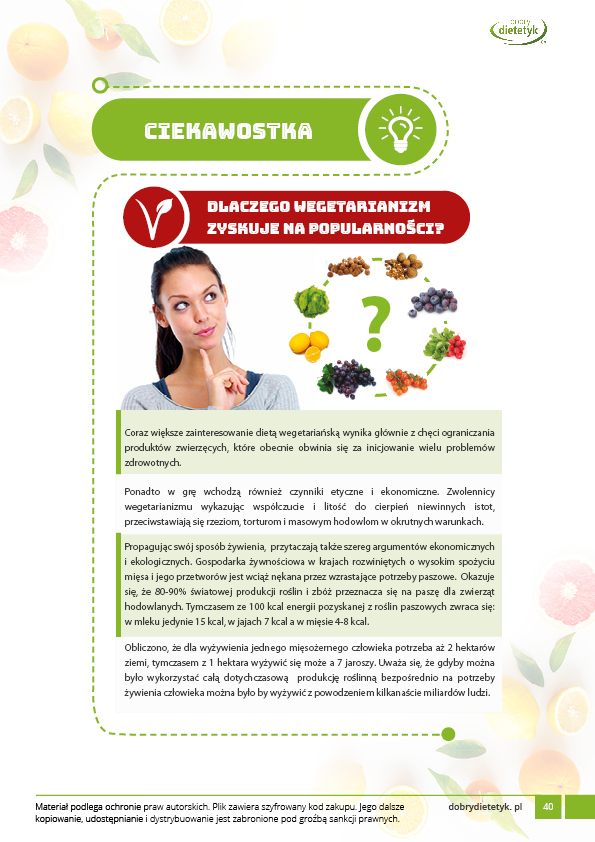 Dodatkowo do opracowanego planu dietetycznego otrzymasz atrakcyjnie przygotowane ciekawostki i wiadomości żywieniowe, które mam nadzieję pozwolą Ci zrozumieć wiele spraw związanych z nurtującym Cię problemem, a także przyczynią się do zwiększenia ogólnej wiedzy żywieniowej.