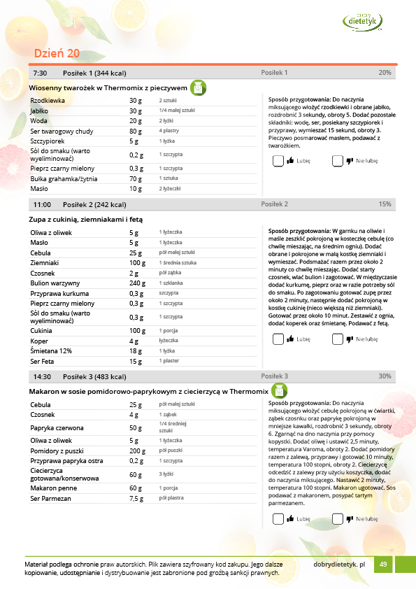 Kompleksowy, 30 dniowy program dietetyczny dla WEGETARIAN z przewagą dań na THERMOMIX. Jadłospis oparto o produkty pochodzenia roślinnego z niewielkim dodatkiem produktów mlecznych i jaj. Dieta została skomponowana przez zespół dietetyków specjalizujących się w tematyce diety wegetariańskiej. Ta bardzo urozmaicona, niezwykle pożywna i wyjątkowo smaczna dieta zadowoli każdego, kto szuka zdrowych i wartościowych dań wegetariańskich. Pod względem odżywczym w diecie położono w szczególności nacisk na podaż takich składników jak białko, żelazo, witaminy grupy B oraz wiele minerałów których często brakuje w dietach roślinnych. Dieta idealnie nadaje się dla osób, chcących też spróbować takiego modelu żywienia.